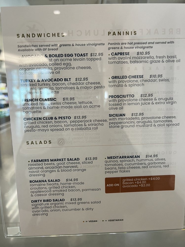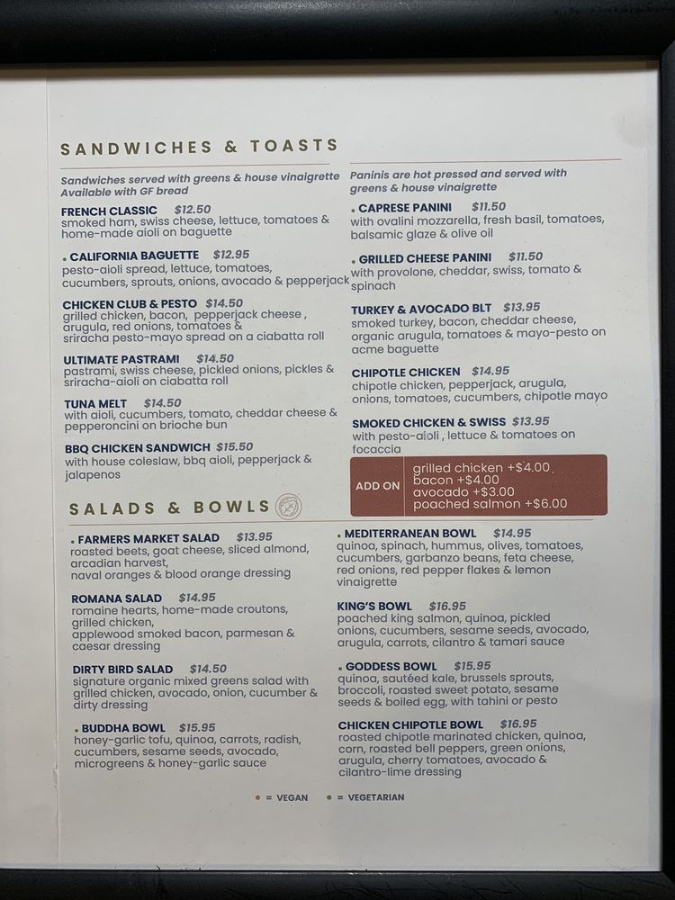 - Sandwiches: Highlights include the Hummus Avocado Toast and the Chicken Club, both made with fresh, high-quality ingredients that evoke the flavors of California.